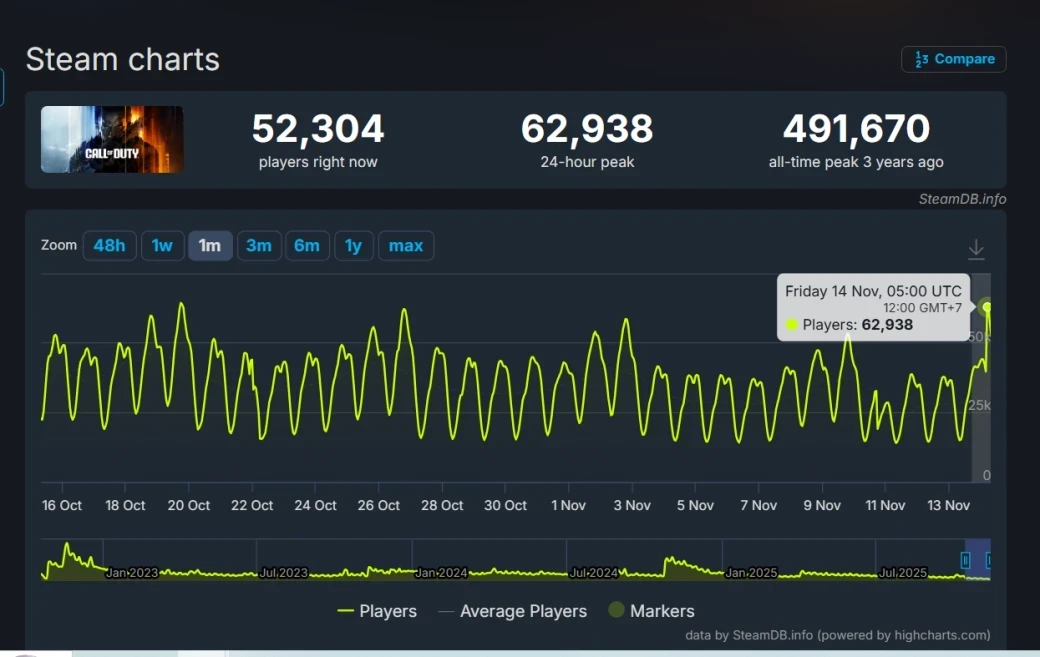 Что до онлайна, то, согласно SteamDB, общая аудитория Call of Duty не особо выросла после релиза новинки. Суточный пик онлайна поднялся до 62 938 игроков одновременно., а на момент написания не превышает и 53 тыс.