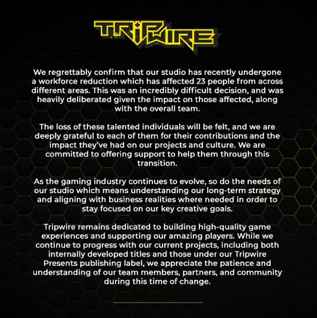 Как это часто бывает, сокращения в Tripwire связаны с нынешними условиями на рынке. Студия хочет оставаться сосредоточенной на своих ключевых целях — понимать долгосрочную стратегию и соответствовать актуальным бизнес-реалиям. Игроков, партнёров и разработчиков поблагодарили за терпение и понимание во «времена перемен».