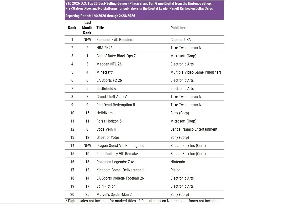 Это явление наблюдается на PC, PlayStation и Xbox. Исключение составляет Nintendo Switch. Там новинка заняла четвёртое место за февраль, причём в составе Generation pack для Switch 2. Топ-3 заняли Mario Tennis Fever, Dragon Quest VII: Reimagined и Pokemon Legends: Z-A.